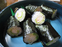 レタス巻き発祥の地は宮崎の一平寿司です。大きな海老が入って950円 |