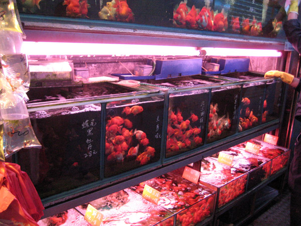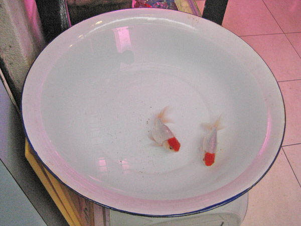 | 金魚はとても運気を高める生き物として香港では人気です。水を常に動かしてくれるということで人気なのでしょう。金運アップとしてとらえているようです。しかし、その販売方法には少しびっくりしました。 |